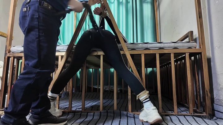 #束心工作室 兰兰白色衬衣套装,老虎凳捆绑挠脚心,拇指铐铐脚趾,红色高跟鞋里面放黄豆,鞋子绳子固定,绳子项圈牵引,手铐脚镣