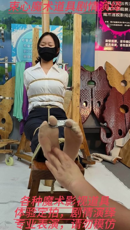 #束心工作室 兰兰白色衬衣套装,老虎凳捆绑挠脚心,拇指铐铐脚趾,红色高跟鞋里面放黄豆,鞋子绳子固定,绳子项圈牵引,手铐脚镣